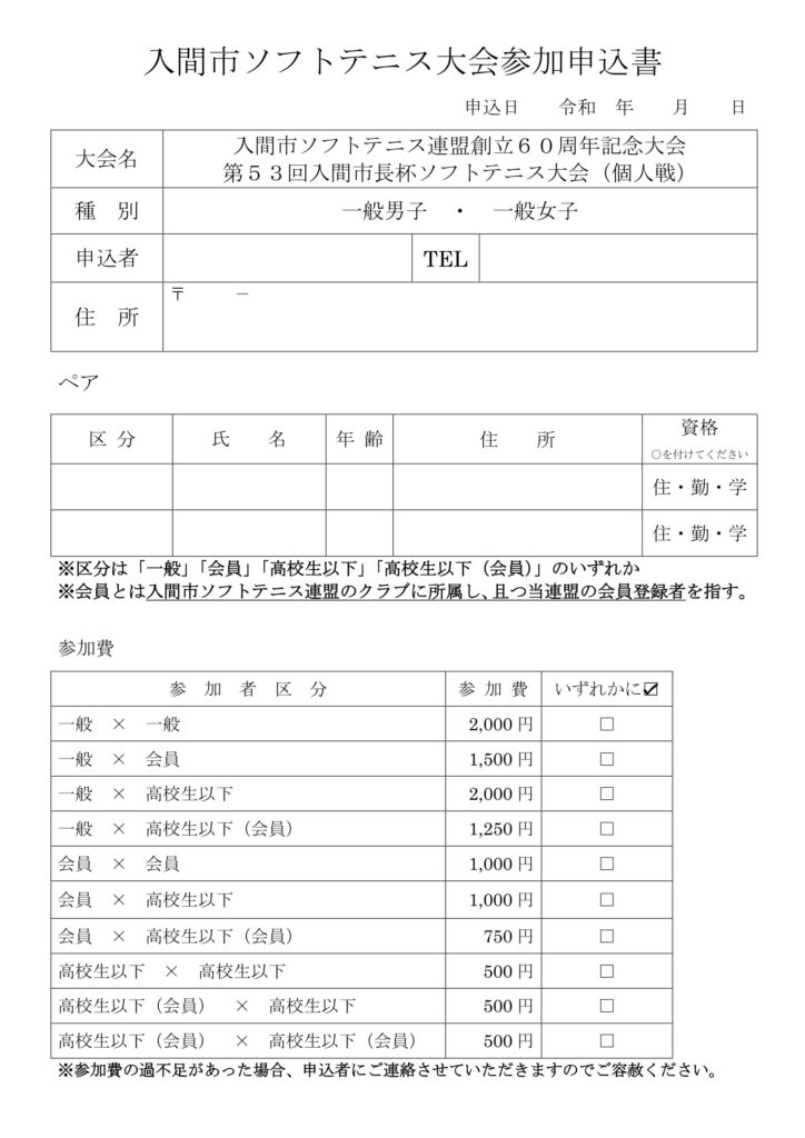 申し込みは、5月11日(月)から5月21日(木)までに、参加費を添えて、入間市民体育館内窓口または入間市スポーツ推進課までお願いします。なお、不参加(体調不良含む)及び荒天・災害(コロナ含む)などのやむを得ない状況での大会中止の場合でも、参加費の返金は一切できません。予めご承知おきください。