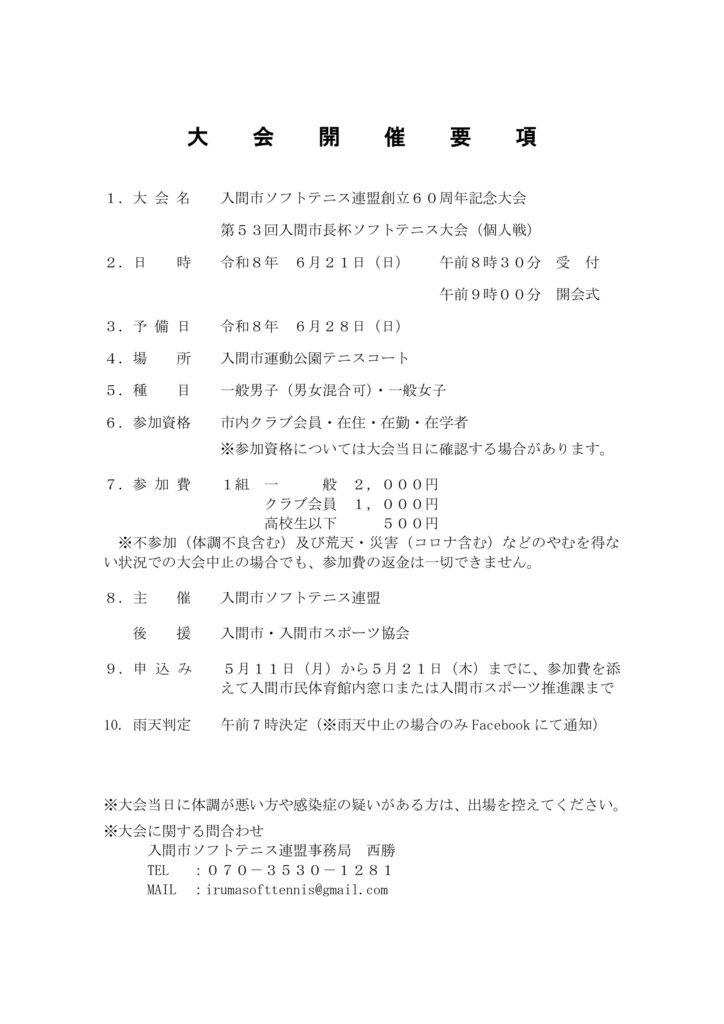 ※記念大会のため、本大会に限り、所沢市・飯能市・狭山市のソフトテニス連盟から男女3ペアずつ推薦いただき、招待選手としてご参加いただく予定です。予めご承知おきください。